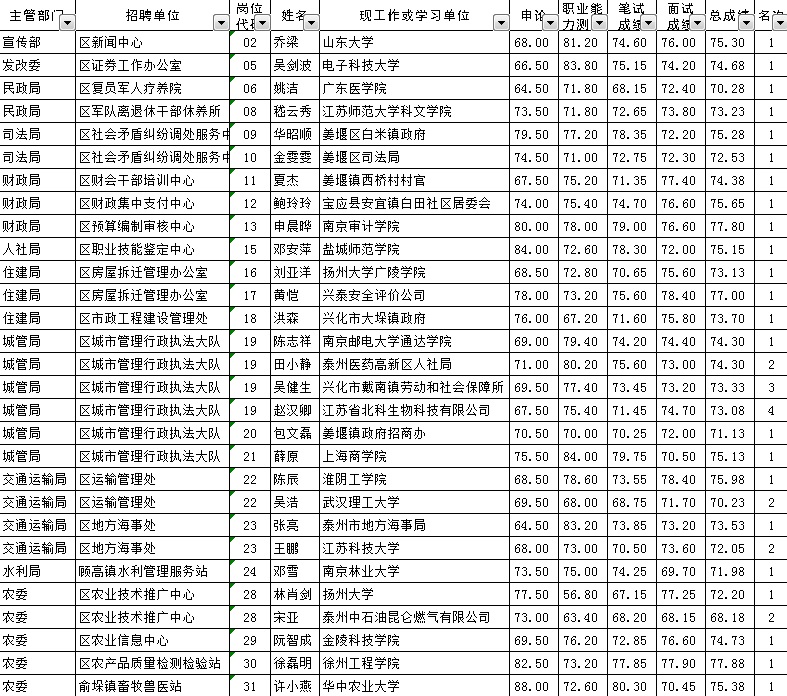 泰州人才網(wǎng)訊:根據(jù)《姜堰區(qū)2013年事業(yè)單位公開(kāi)招聘人員簡(jiǎn)章》規(guī)定,經(jīng)報(bào)名、筆試、面試、體檢、考察等程序,喬梁等73同志(名單附后)符合相應(yīng)事業(yè)單位聘用條件?,F(xiàn)向社會(huì)公示,如發(fā)現(xiàn)公示對(duì)象有不符合招聘條件的,可以通過(guò)來(lái)信、來(lái)電、來(lái)訪等形式向區(qū)紀(jì)委、區(qū)委組織部、區(qū)人社局反映(聯(lián)系電話(huà):88869216、88869186、88869415)。公示時(shí)間為201…